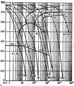 從45號鋼的連續(xù)冷卻轉變曲線圖分析,若得到完全馬氏體,在整個冷卻過程中,在600℃左右,要求冷速達到最大值,速率剛好大于等于臨界點,不和S曲線的鼻尖處相交。此處冷速越慢,發(fā)生鐵素體析出或非馬氏體組織的形成。